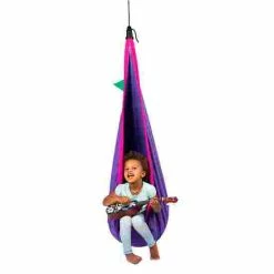 Cosy chill-out space: children love to curl up in this teardrop-shaped hanging nest, floating just above the floor. With its large, soft seat cushion (cover: 100% polyester), the nest is a quiet and safe place for them to relax. Children can also cling onto the nest and use it as a monkey swing. Cushion is removable. ø 70 cm, H: 150 cm. Pure organic cotton from controlled organic cultivation. Max. load: 80 kg.