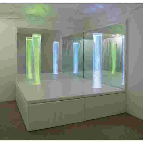 The padded platform is a sturdy, square wooden construction with 5-cm-thick foam padding in white. The bubble pillars are put into the platform and offer a place to sit or lie down. This allows you to experience the effect of the bubble pillars ‘from a distance’.