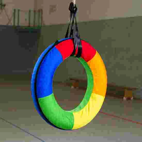 Swinging is lots of fun with the tyre ring from Sport-Thieme! Thanks to the blue, green, red and yellow cover, the swing is just begging to be played with. The polyamide material is exceptionally robust – it protects the air tube and is ideal for holding onto and climbing on when swinging. The suspension system is attached to the cover: use the snap hooks to attach the reinforced straps and the suspension rope. The tube in the cover is accessed using the all-around zip.